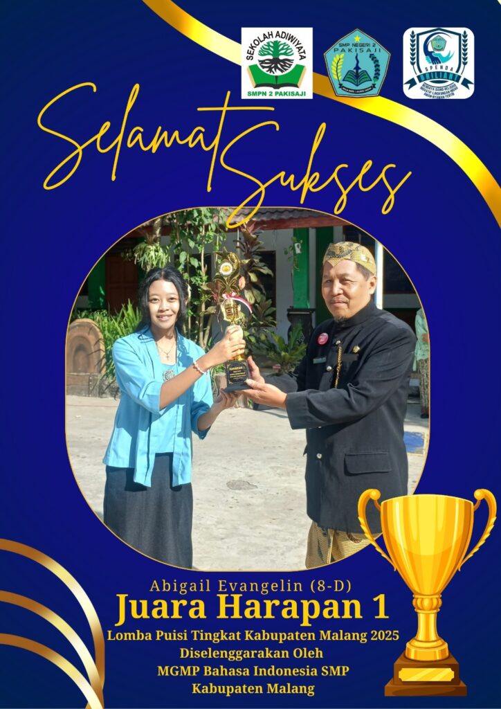 Satu lagi prestasi membanggakan diraih oleh siswa SMP Negeri 2 Pakisaji. Kali ini datang dari Abigail Evangeline, siswi kelas 8-D, yang berhasil meraih Juara Harapan 1 dalam ajang Lomba Puisi Tingkat Kabupaten Malang Tahun 2025. Kompetisi bergengsi ini diselenggarakan oleh MGMP Bahasa Indonesia SMP Kabupaten Malang, yang mempertemukan para peserta terbaik dari berbagai sekolah di […]