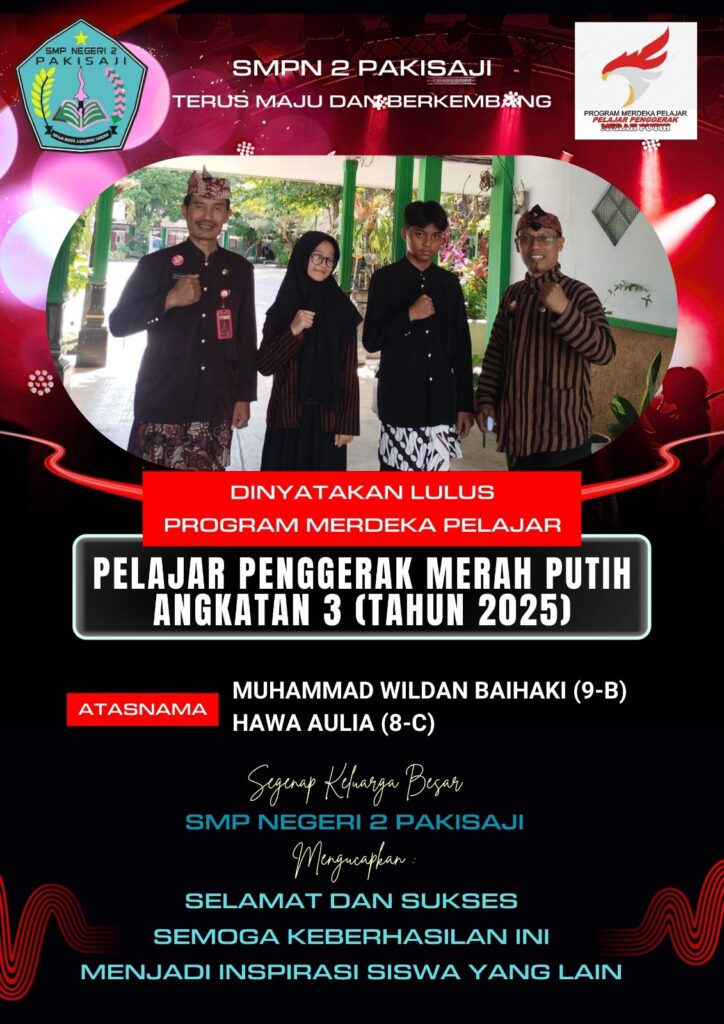 SMP Negeri 2 Pakisaji kembali menorehkan prestasi membanggakan melalui dua siswanya yang dinyatakan lulus Program Merdeka Pelajar: Pelajar Penggerak Merah Putih Angkatan 3 Tahun 2025. Mereka adalah: